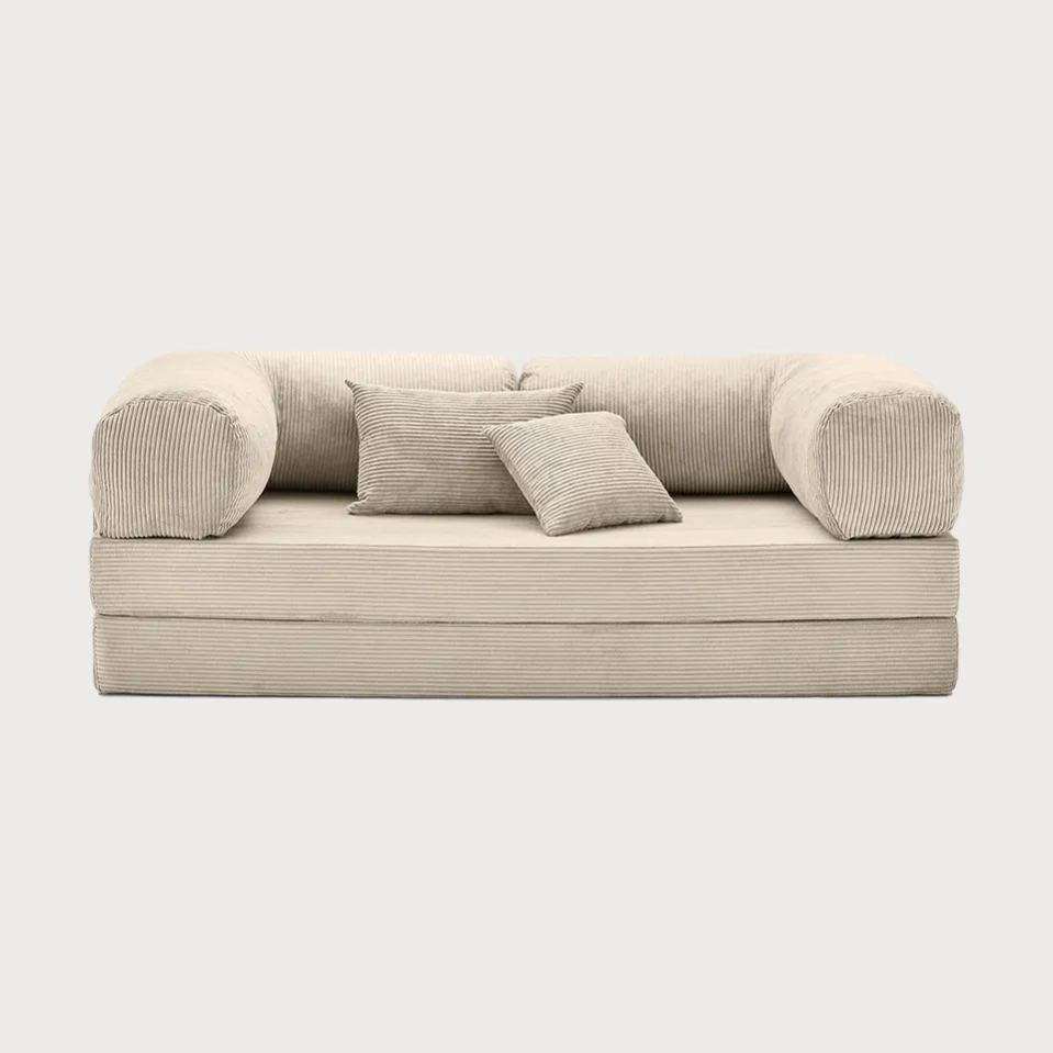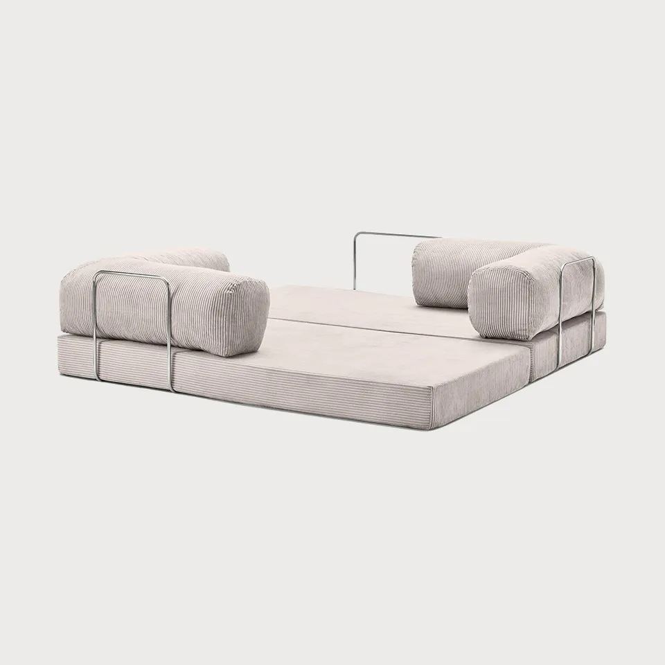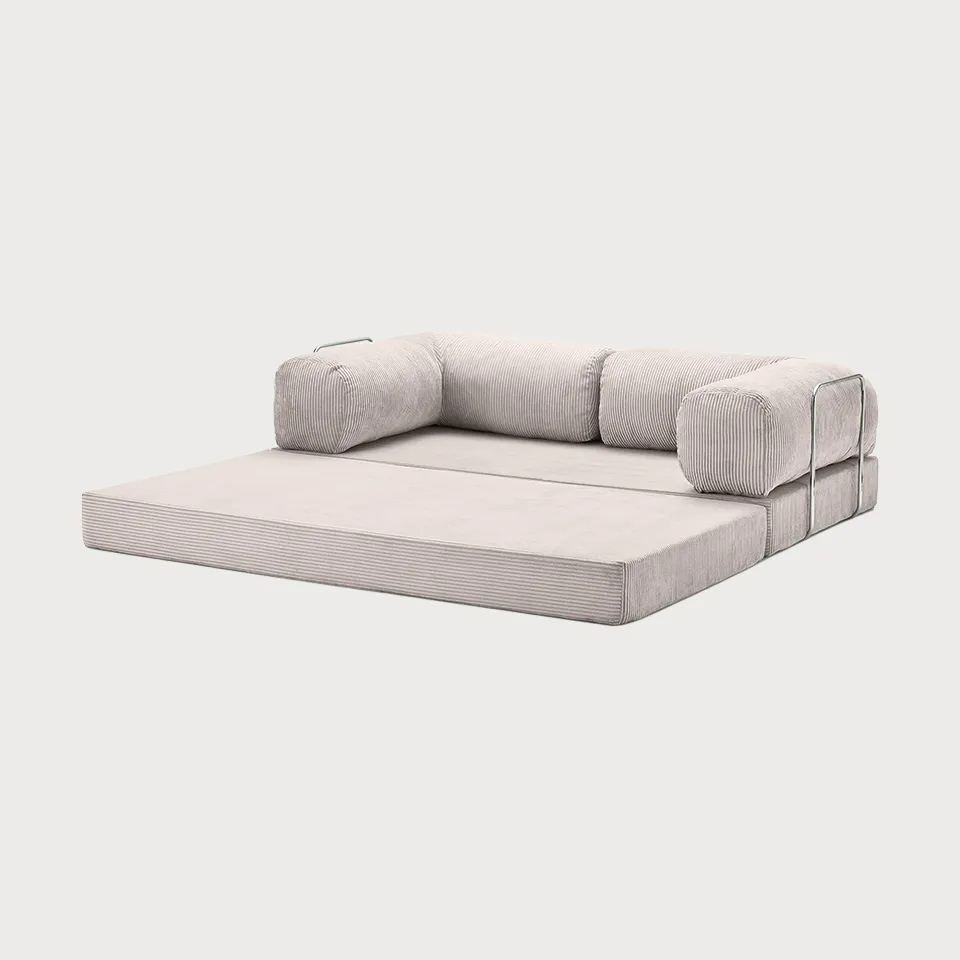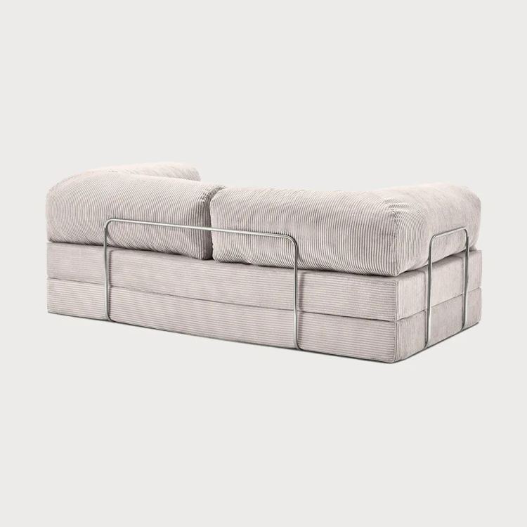 Our mattresses have a density of 30 kg/m3, so it’s quite firm and hard to sit on, so it's not like a "regular" sofa where you will melt into it. It's made on the harder side so the foam doesn't lose its form and you can lay on the floor on only one mattress and use it as a double bed, without being too soft or uncomfortable. So it's perfect for people sleeping over and you can add sheet and you're all ready to go