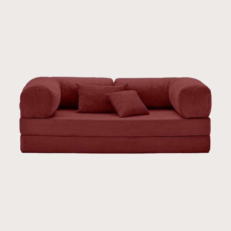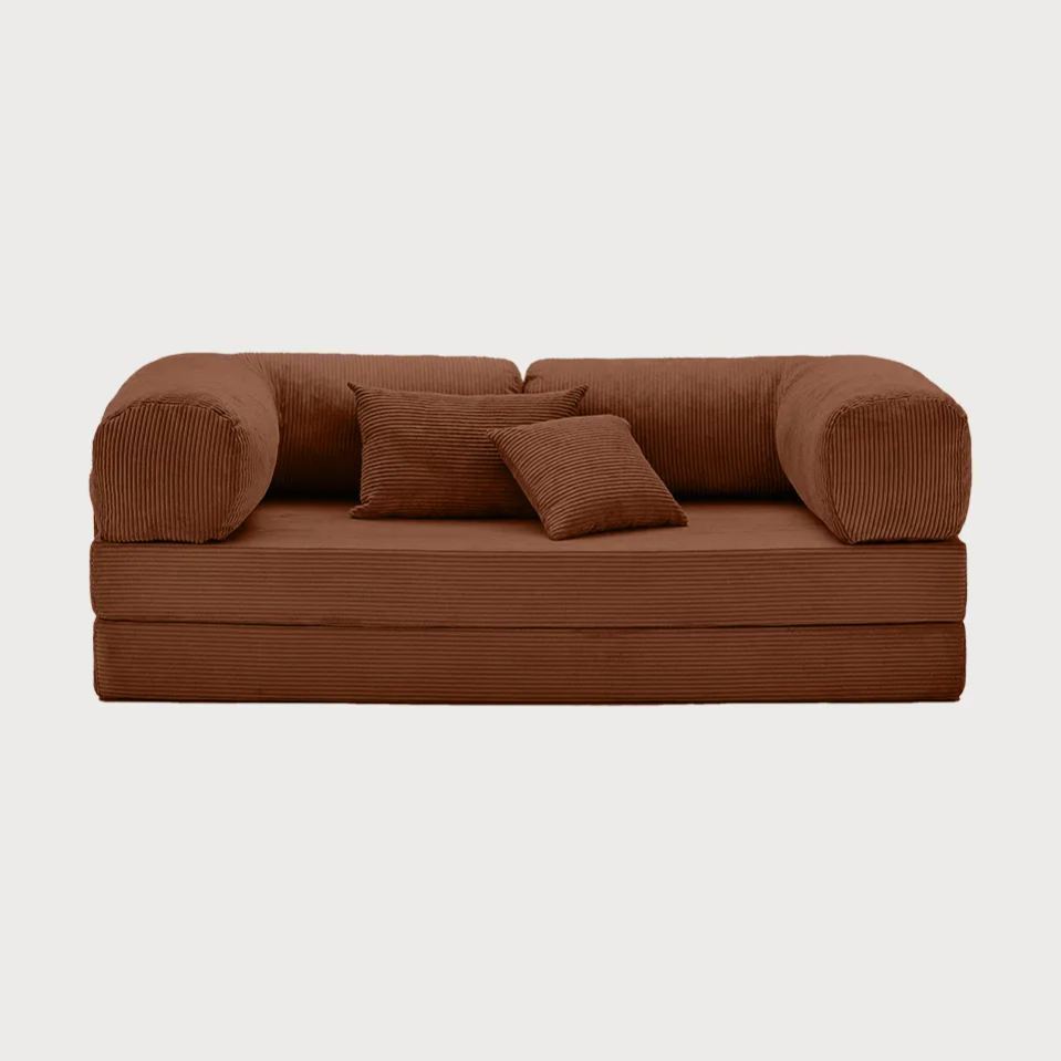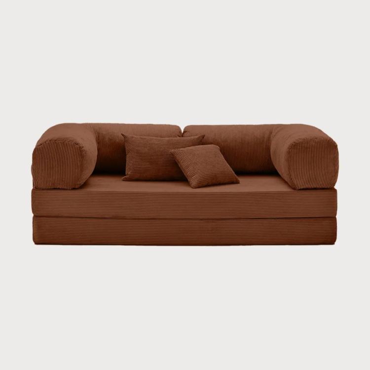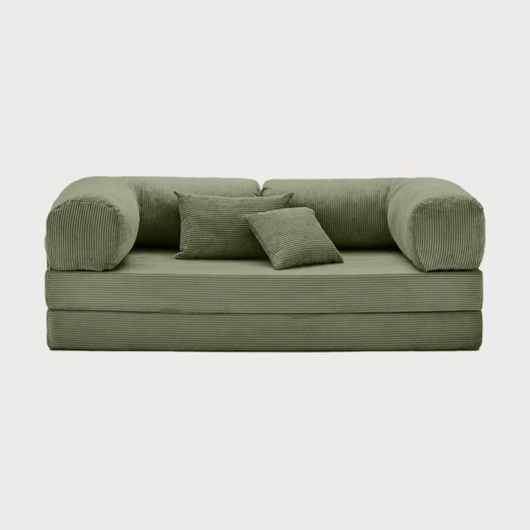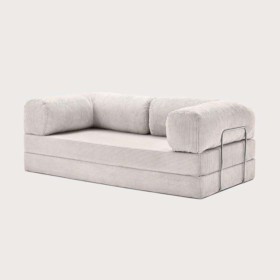Our mattresses have a density of 30 kg/m3, so it’s quite firm and hard to sit on, so it's not like a "regular" sofa where you will melt into it. It's made on the harder side so the foam doesn't lose its form and you can lay on the floor on only one mattress and use it as a double bed, without being too soft or uncomfortable. So it's perfect for people sleeping over and you can add sheet and you're all ready to go